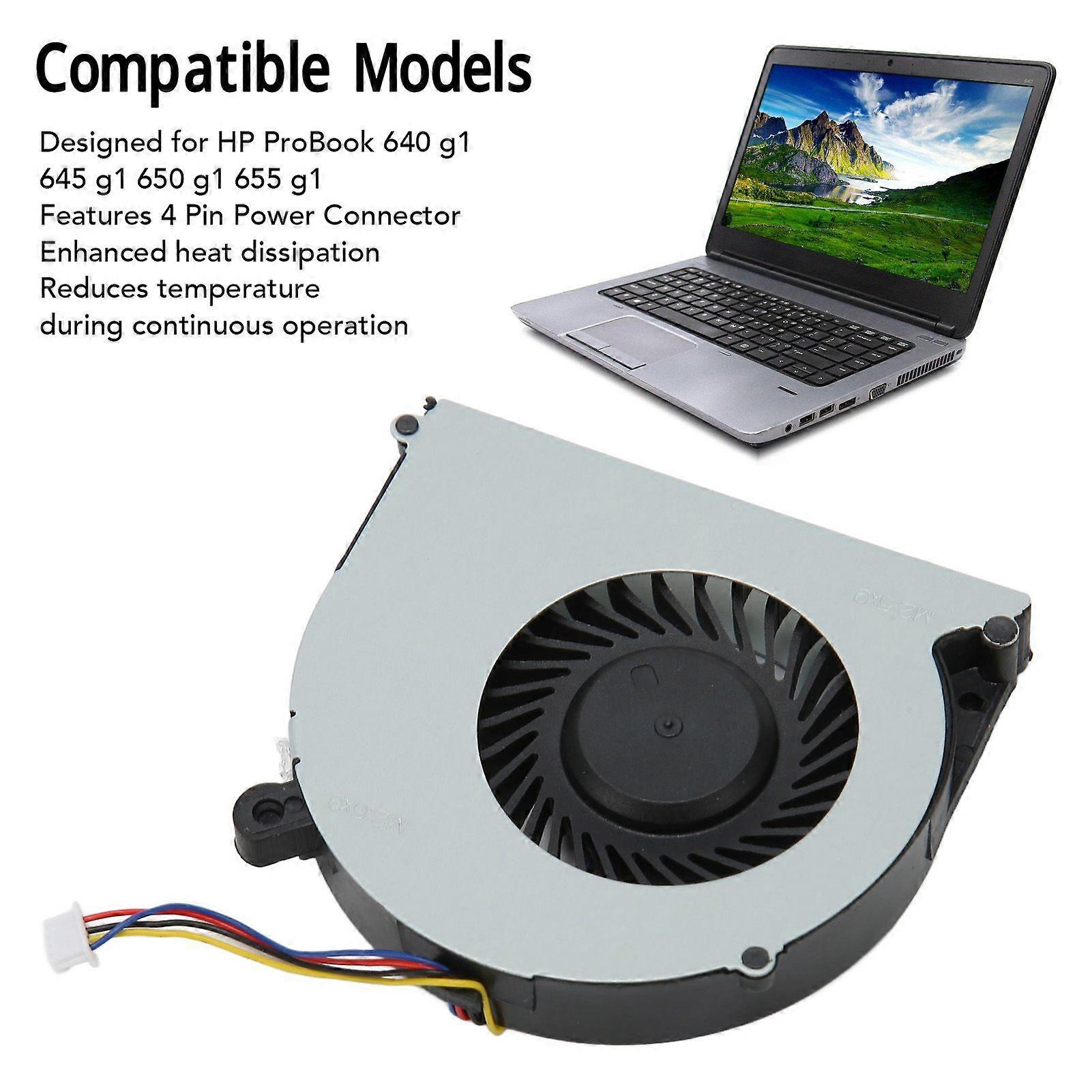 Feature:1. Compatible Models: CPU cooling fan designed for HP ProBook 640 g1 645 g1 650 g1 655 g1, precisely sized to ensure a perfect fit for installation.2. Enhanced Heat Dissipation: With 4 pin power connector, the new CPU cooling fan enhances heat dissipation and reduces temperature during continuous operation.3. Premium Materials: This laptop CPU cooling fan is made of premium aluminum alloy and ABS materials, sturdy and durable, not easy to damage.4. Replacement: For replacing your faulty, broken, damaged notebook CPU cooling fan, easy to connect, convenient to operate and use, easy to install and remove.5. Light Weight: Compact laptop CPU cooler, light weight, will not increase the burden of the laptop, effective heat dissipation to improve the efficiency of your laptop.Specification:Item Type: CPU Cooling FanMaterial: Aluminum Alloy, ABSPower Connection: 4 PinInput: DC 5V 0.5AApplicable Models: For HP ProBook 640 g1 645 g1 650 g1 655 g1.Package List:1 xCPU Cooling Fan