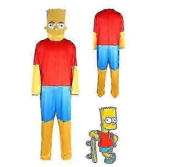 Boys Bart Simpson Costume Jumpsuits Lisa Marge Homer and Marge Cosplay Birthday Party Fancy Dress w/ mask Halloween For Adults Men Women Kids This animated comedy focuses on the family in the town of Springfield. The head of the Simpson family Homer is not a typical family man. A nuclear-plant employee does his best to lead his family but often finds that they are leading him. The family includes blue-haired matriarch Marge troublemaking son Bart overachieving daughter Lisa and baby Maggie. The perfect gift for kids everywhere. Whether it be for Christmas or a Birthday this iconic mens The Simpsons costumes pays homage to one of the most famous logos in the world. color contrast printed pattern come with mask back Velcro