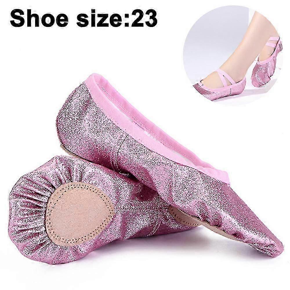 Material: cow leather, cotton matt Size: 23 (shoe length 151mm), 24 (shoe length 156mm), 25 (shoe length 163mm) Color: shiny pink, shiny blue Quantity: 1 piece Paage content: 1 * kids ballet shoes 1. Upper material: Matt. This ballet shoe is made of matte and is very comfortable, light and wear-resistant, washable. 2. Inner material: cotton. The ballet shoes are made of high quality cotton lining that absorbs sweat and is breathable, keeping feet dry and comfortable. 3. COMFORTABLE: Ballet Shoes is made of comfortable and breathable, basic color suits for wedding, party, performance, ballet class and daily wear 4. SAFETY: With elastic drawstrings, dance flat can be adjusted tight or loose, bring the most comfortable tightness for the feet and will not hurt the feet.Padded with anti-slip suede sole, add more secure traction and prevent slips and if. 5. GREAT GIFT Perfect for ballet, dance, gymnastics, yoga, modern, ballroom, normal practice, class show, performance and wedding etc. Provide enough support for the beginners and professional dancer, a perfect birthday, Christmas, ba to school gift.