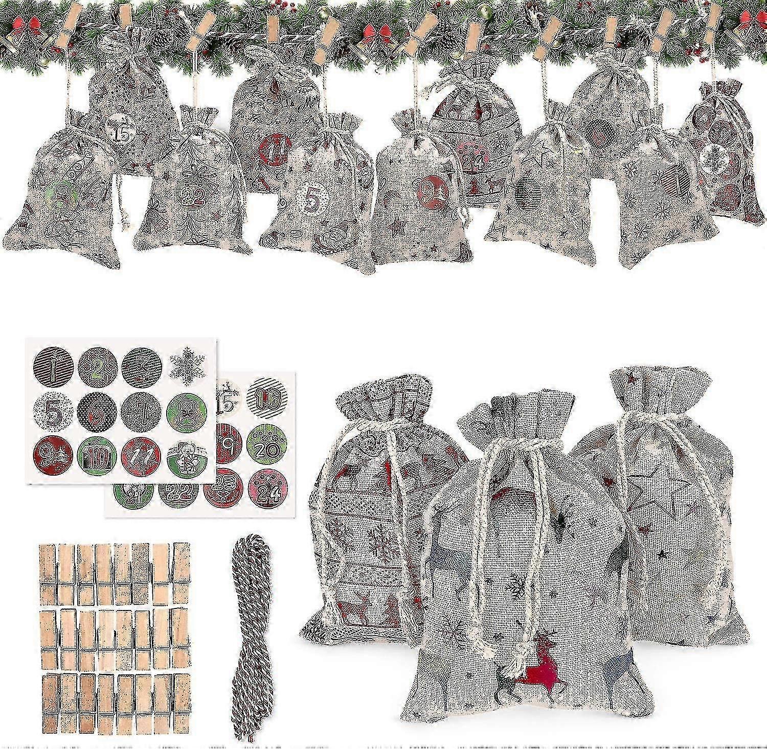 Jute bag advent calendars Our 24 jute bag advent calendars contain 12 different patterns with 24 number stickers that can be easily dismantled and stuck on the bag. Children can easily count to Christmas by putting candy or gifts in their bags every day and adding a cozy, homely atmosphere to your Christmas vacation.PREMIUM MATERIAL The advent calendar for Christmas is made of high-quality linen with sturdy red, green and white lines to keep the presents safely closed. Each bag measures 7.08 x 4.92 inches. Finely built. Quality craftsmanship ensures this calendar can be used year after year. It's the best choice for your Christmas countdown.HOLIDAY DESIGNSpecific and unique design. This cute Christmas advent calendar features a variety of classic Christmas elements such as five-pointed stars, hanging balls, elk, snowflakes, bells, Christmas stockings, Christmas trees and Santa Claus. Red and colored patterns enhance the festive mood and are perfect for Christmas decorations.Our products include 24 Christmas cards (12 different patterns), 24 number stickers and 24 wooden clips (1.7 x 0.5 inches) as well as 10 m long red and green cotton ropes. If the product has any questions, please contact us immediately, we will provide an after-sales service that will satisfy you.