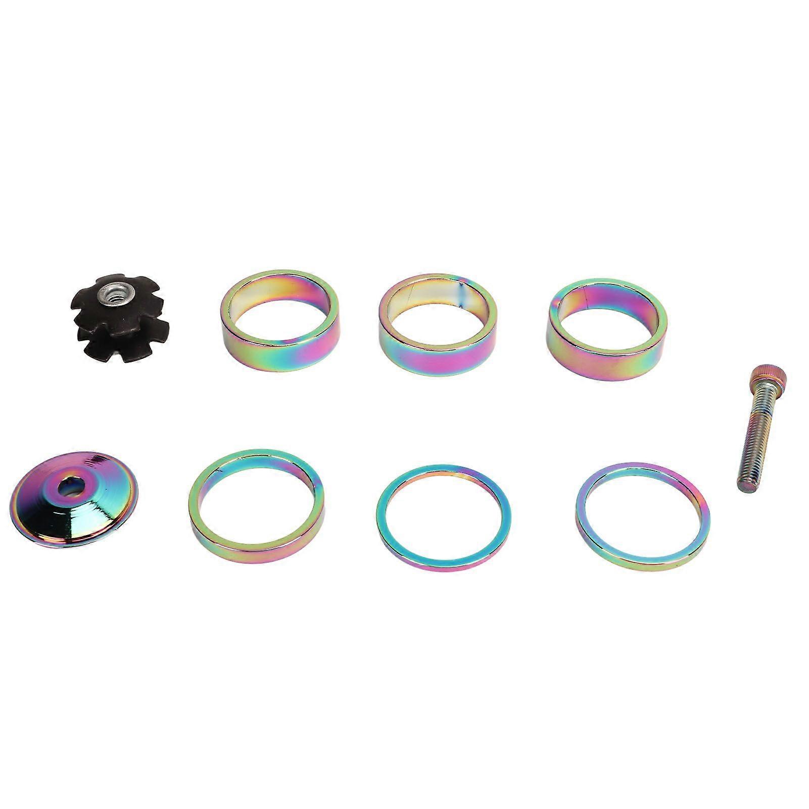 Features1ALUMINUM ALLOY: Crafted from aluminum alloy, these spacers are abrasion resistant, durable, and built to last. They provide protection for your bike's front fork assembly. 2EYE CATCHING AND PRACTICAL DESIGN: With their colorful and fine edges, these spacers add a touch to your bike while also offering practicality and durability. Express your individuality and make your bike stand out from the crowd. 3INCLUSIVE SET FOR VERSATILE USE: This set includes three 10mm spacers, one 5mm spacer, one 3mm spacer, and one 2mm spacer, satisfying the majority of usage requirements across different cycling situations. 4SUITABLE FOR VARIOUS BIKES: Designed with a 28.6mm inner diameter, these spacers are compatible with most bikes, including mountain bikes, road bikes, fixed gear bikes, mountain bikes, folding bikes, and touring bikes. 5EASY INSTALLATION AND SECURE FIT: These spacers are effortless to install and provide a secure fit for your bike's front fork assembly, ensuring accuracy and stability during your rides.SpecificationItem Type: Bike spacerMaterial: Aluminium alloyWeight: Approx. 60g / 2.1ozInner Diameter: 28.6mm / 1.1inPackage List6 x Spacer1 x Screw1 x Headset Star Nut1 x Stem Top Cap