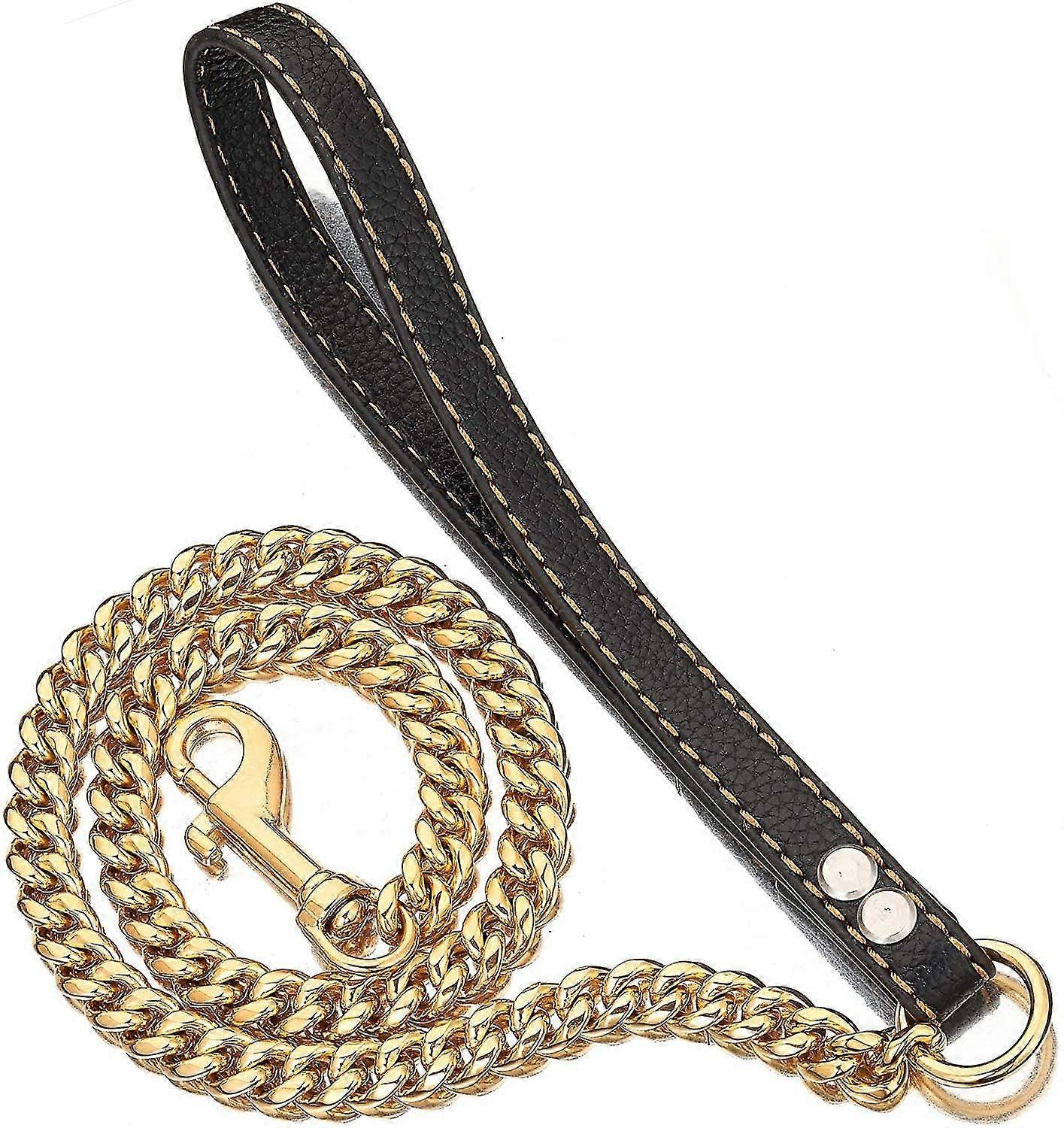 Gold Dog Chain Leash For Cuban Link Collar 12mm Heavy Duty Metal Pet Leash Chain With Leather Padded Handle For Large