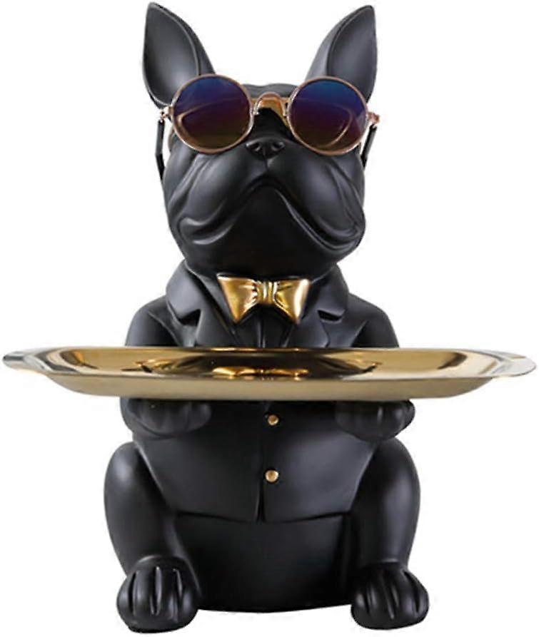 Resin Cool Dog Sculpture Bulldog Decorative Figurine Storage Tray Coin Bank Entrance Key Snack Holder Modern Art Statue (Black)