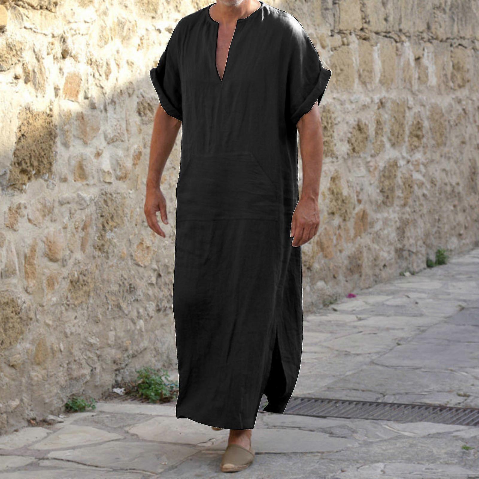 Men S Jubba Thobe Kaftan Muslim Arab Islamic V-neck Short Sleeve Solid Cotton Linen Robes Muslim Fashion Arabia Man Abaya