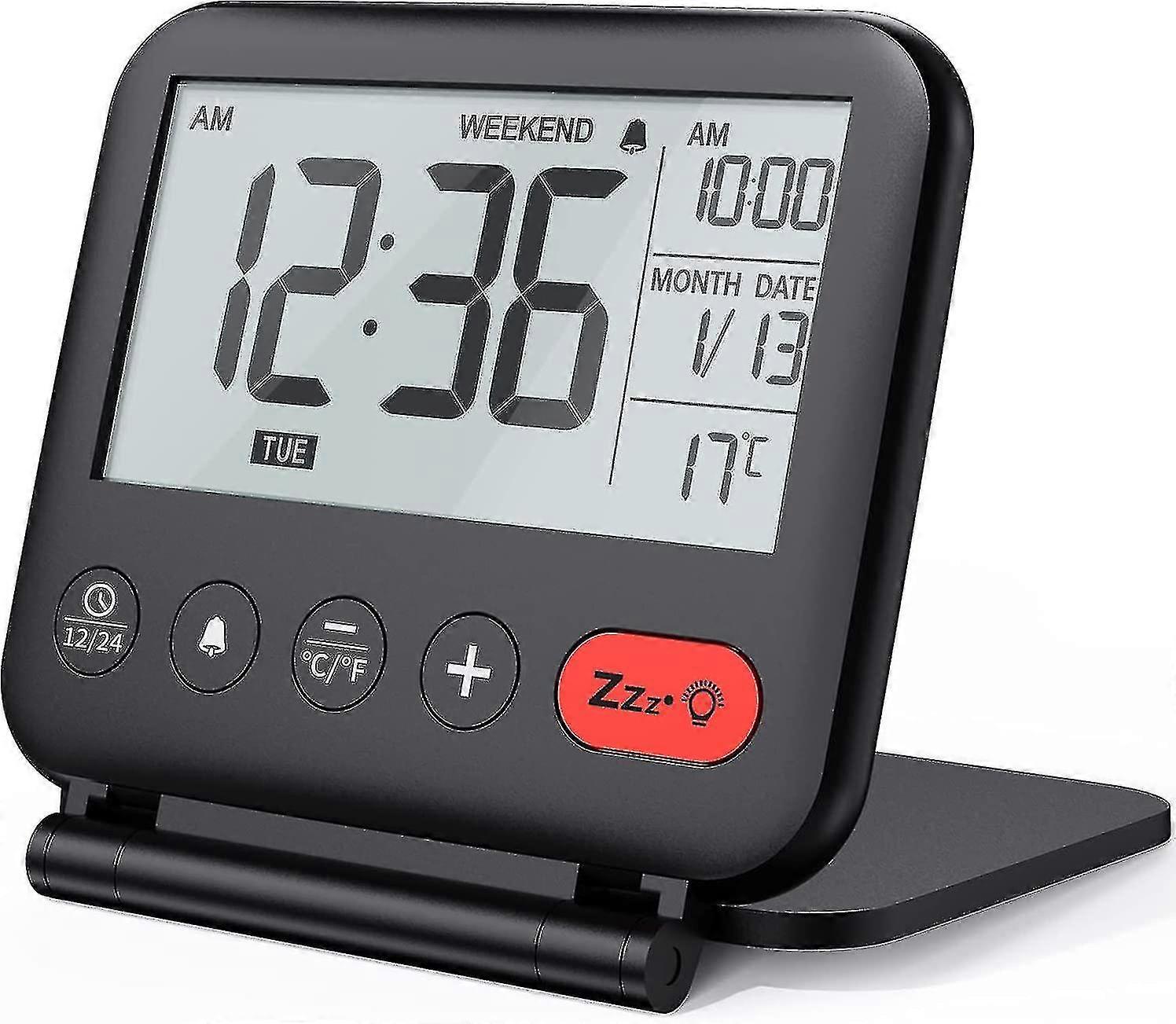 Digital Travel Alarm Clock Mini Portable Lcd Display Clock With Backlight Calendar Temperature Snooze 12/24h Makeup Mirror, Small Folding Battery Ope