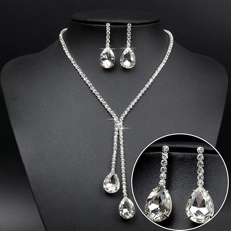 Wedding Luxury Water Drop Crystal Rhinestone Necklace Earrings Jewelry Set
