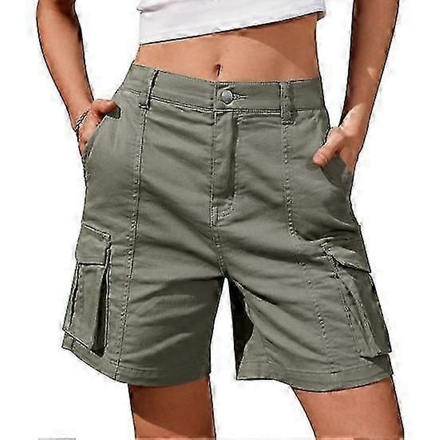 Women Shorts High Waist Wide Leg Knee Length Button Zipper Fly Pure Color Elastic Waist Multi Pockets Deep Crotch Loose Thin Quick Dry Lady