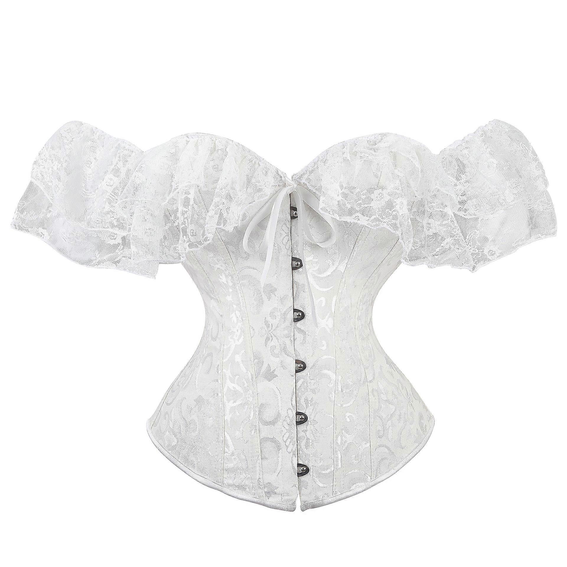 Ladies Jacquard Lace Court Short Sleeve Body Suit Masquerade Waist Corset Top Sexy Wedding Boning Suit