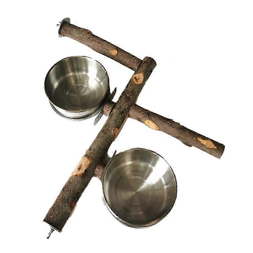 Bird Perch Parrot Natural Stand with 2Pcs Stainless Steel Food Water Bowls