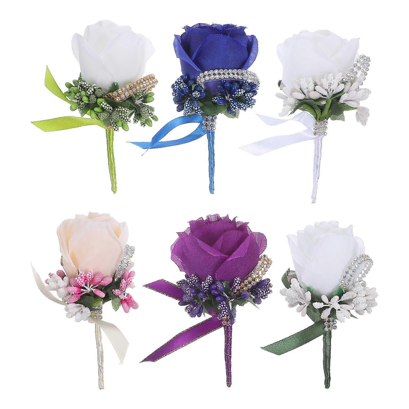 Silk Bride Boutonniere with Rhinestone Decoration for Wedding Use 6pcs Assorted Color