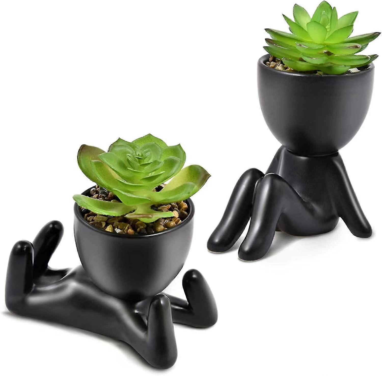 Fake Succulents, Cute Artificial Succulents Plants In Human-shaped Ceramic Pots For Desk Livingroom Bathroom And Home Office Dcor- 2 Pcs (black)