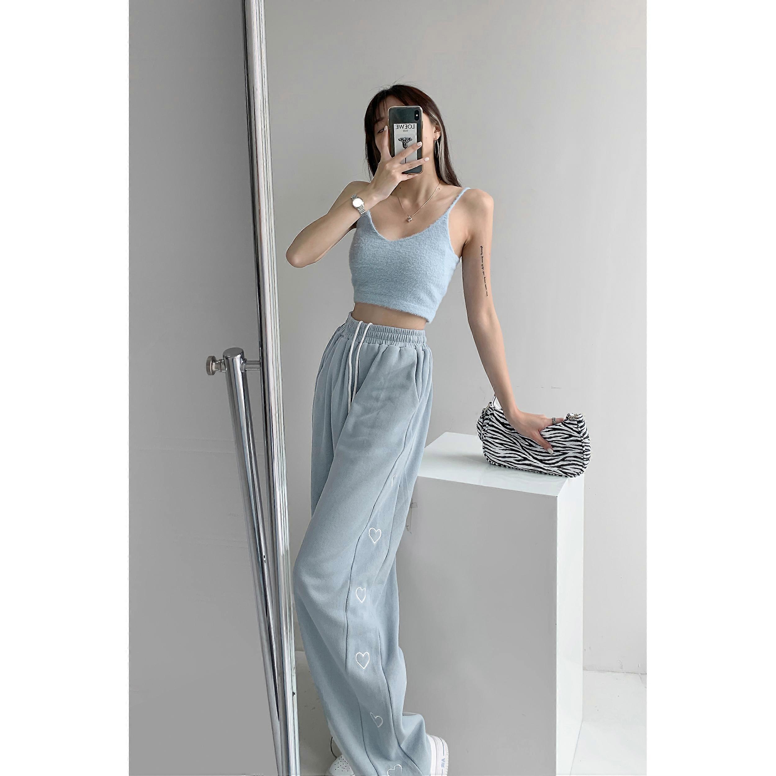 Gouache Blue Loose Sports Pants Women's Side Love Embroidery Stitching Slim-Fit Pants High Waist Casual Straight Pants