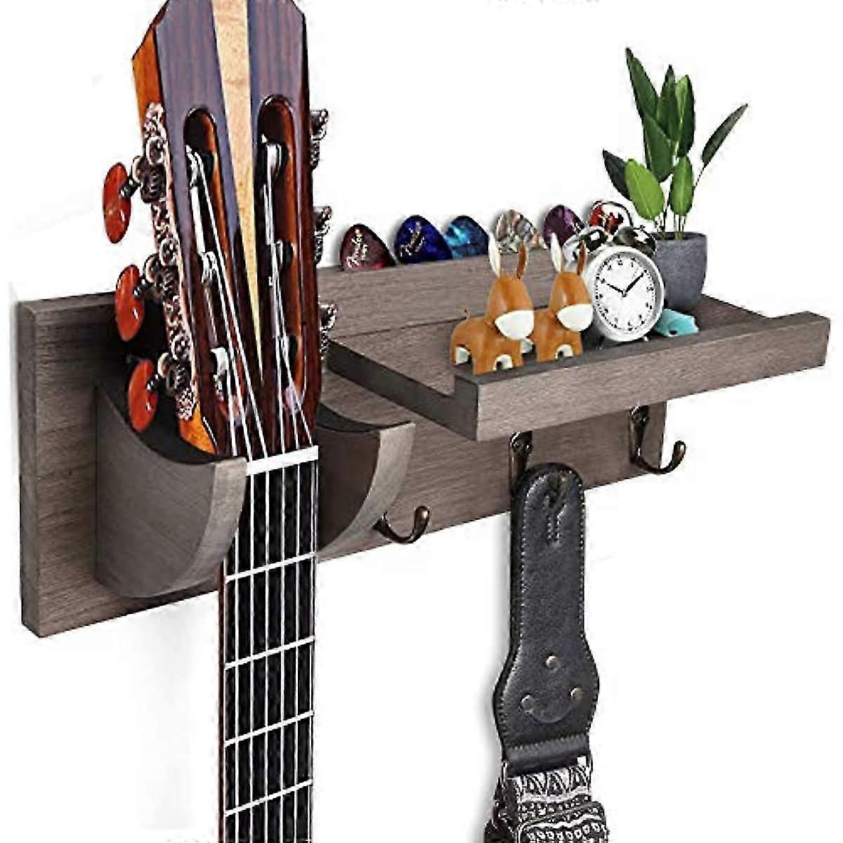 EXTRA STORAGE SHELFSize:40*19*7cm, Weight:800g. Mounting hardware is included. The upper flat shelf in this rack is perfect for storing smaller items like letters, mails, herbs, spices or displaying photos, small plants and knick-knacks. FUNCTIONAL DESIGNThis shelf with guitar stand is made of 100% solid wood, and the material is safe. After varnish treatment, it feels smoother and the surface colour is brighter. With its simple colour, it perfectly matches the style of your furniture and room. Save SpaceThe excellent guitar wall hook stand, which can not only display the guitar but also store guitar accessories, such as guitar picks, straps, tuner, guitar capo, etc. Just grab and go, no more dealing with cases. Universal Fits Most Musical InstrumentsOur guitar wall mount is suitable for most musical instruments, such as folk guitar, electric guitar, ukulele, zither, etc. But we recommend testing the width of your instrument before buying.