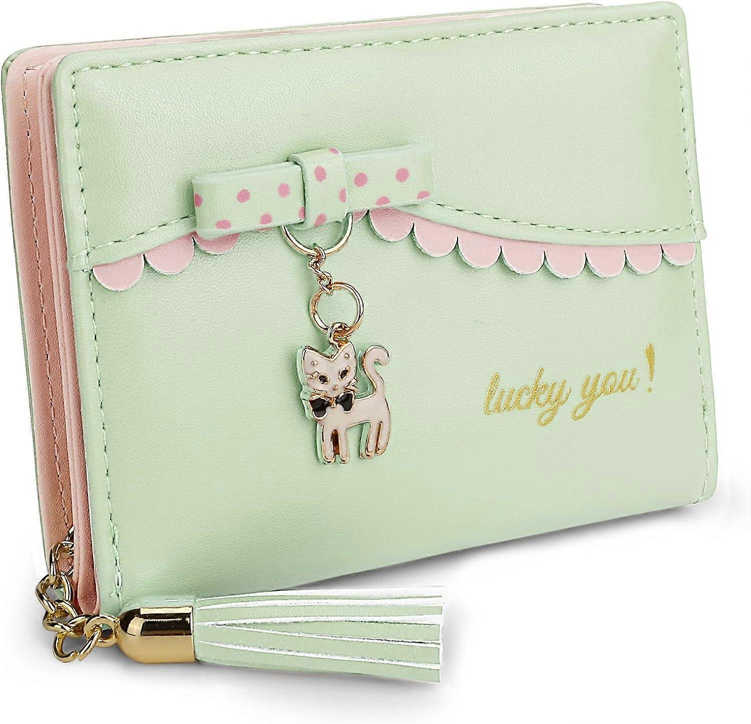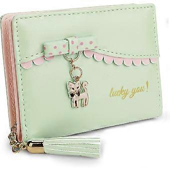 Girls Wallet Small Card Holder Women Purse Bifold Vegan Leather Zipper Coin Pocket Cute Cat Pendant Tassel