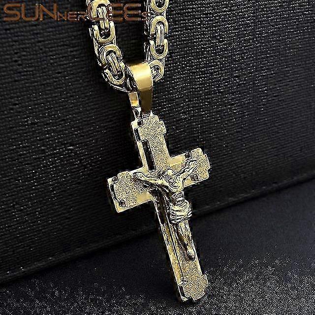 Stainless Steel Jesus Christ Cross Pendant Necklace Byzantine Link Chain Silver Color Gold Plated Men Boy Gift Sp217