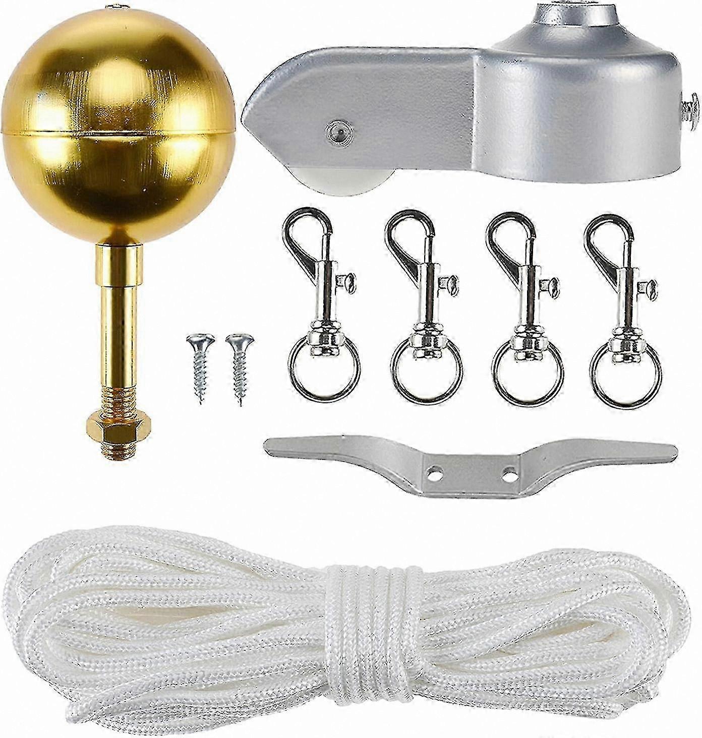 Gold Ball Flagpole Topper with 50 Ft Halyard Rope, 4 Cleat Hook, and 4 Swivel Hardware for Flag Poles