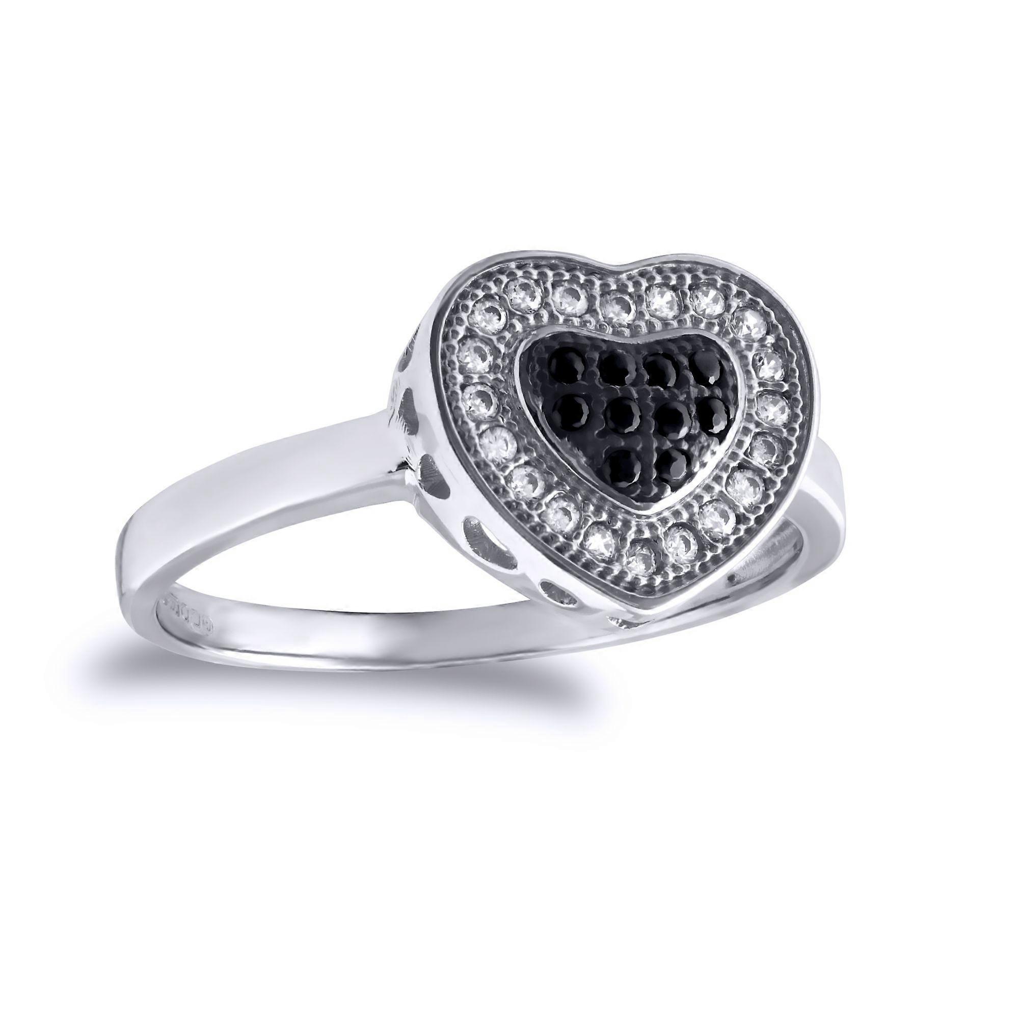 Jewelco London Ladies Solid 9ct White Gold Black and White Round Brilliant Cubic Zirconia Love Heart Pave Ring