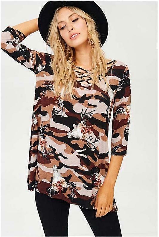 Women Camouflage Floral Bull Head Cowskull Casual Jersey Blouse Top
