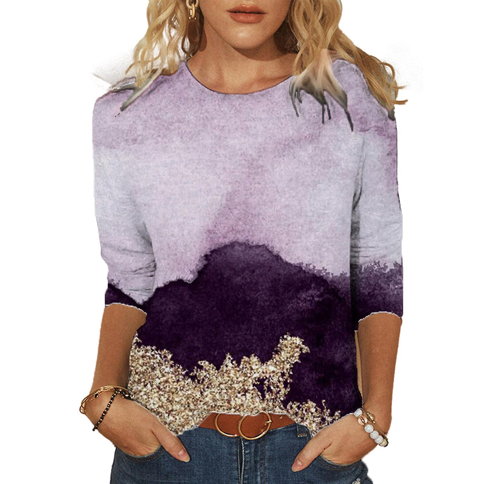 Women's Spring Printed Casual T-shirt Top Cotton Cinched Waist Mid-long Sleeve Crewneck Shirt