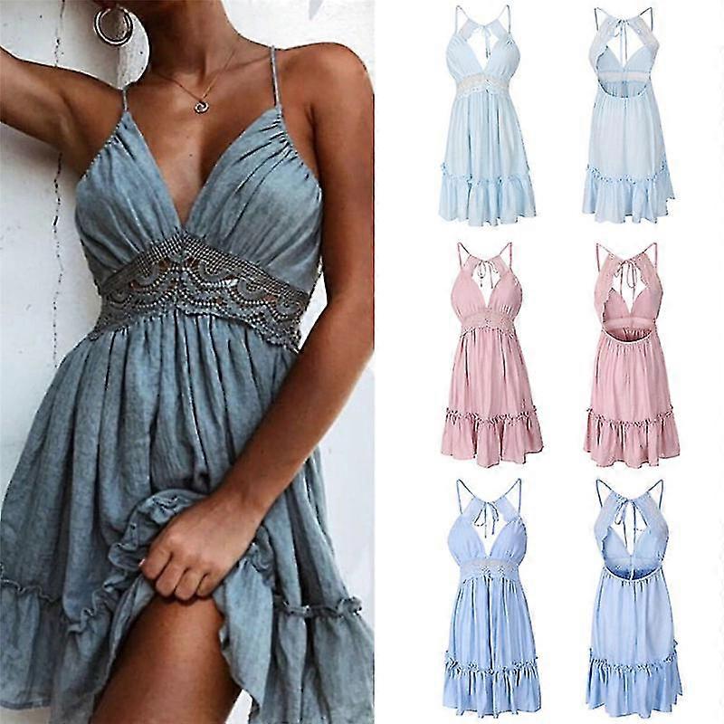 Women's Summer Sleeveless Backless Dress Backless Low Cut Spagehetti Strap Swing Cami Mini Beach Dress Sexy Sundress