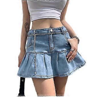 Women's Summer Casual Slim Pleated Ruffle Denim Skirts High Waist Harajuku Goth Punk Girls Vintage A-line Short Jean Mini Skirts, Light Blue