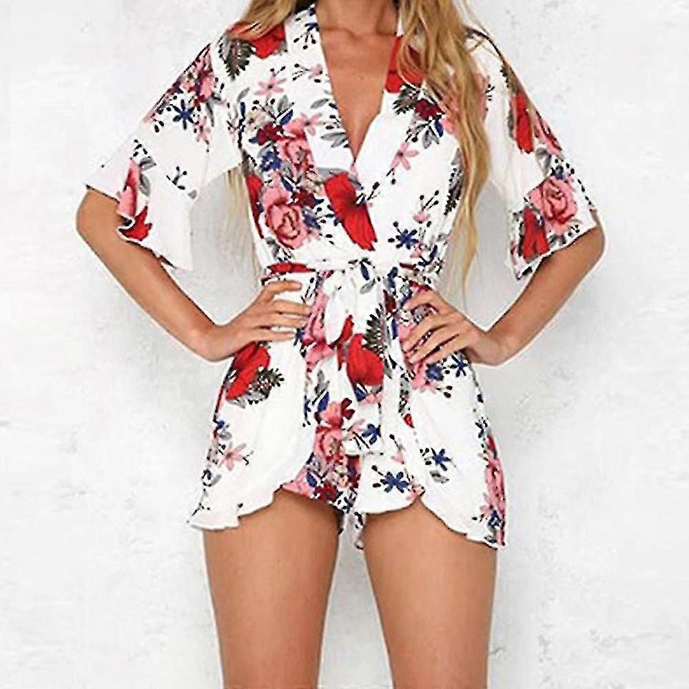 Women\'s Jumpsuit Flower Printed V-neck Rompers Ruffle Sleeve Backless Rompers