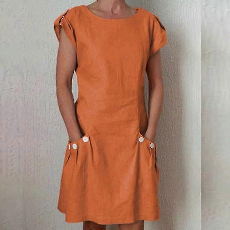 Women Crew Neck Tunic T Shirt Dress Buttons Double Pockets Summer Sundress Boho Short Sleeve Solid Color Mini Dresses