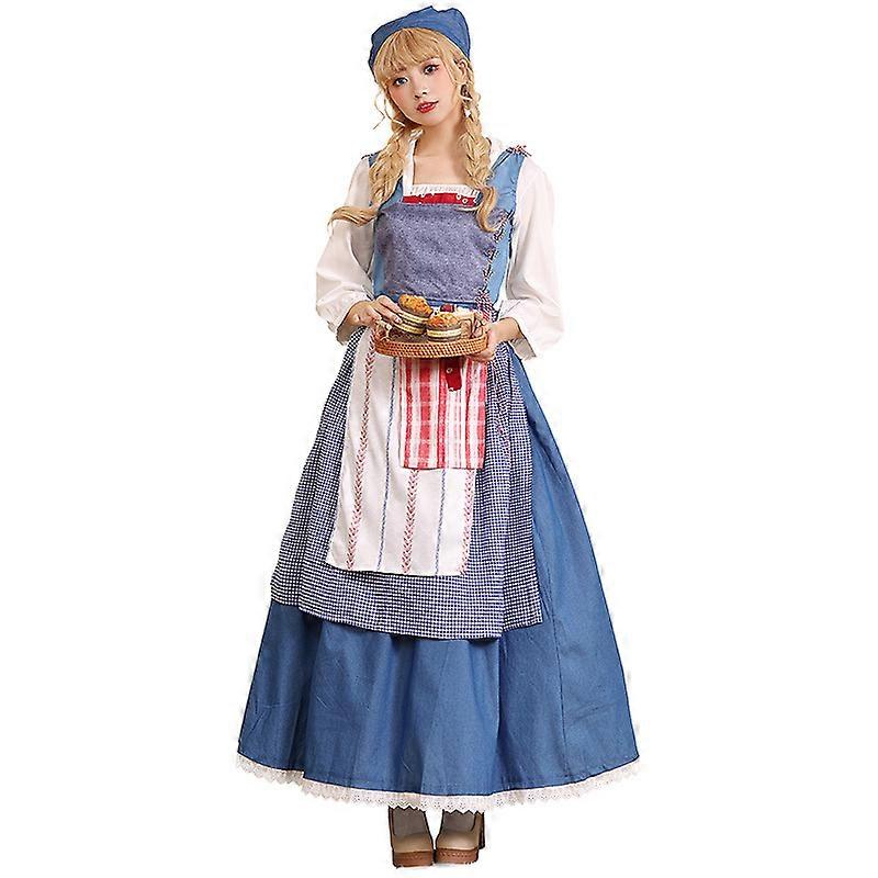 Women Square Collar Halloween Costumes Cosplay Farm Costume Blue Patchwork Maid Dress Cotton French Fairy Tale 2022 Long Dressas Picture