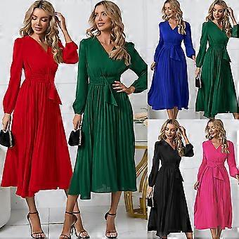 Women Long Sleeve Slim Fit Pleated Belt V-neck Dress Fashionable A-line Skirt DGZD