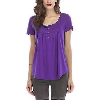 Women Plain Solid Buttons Tops Pleated T-shirt Short Sleeve Casual Crew Neck Tee Blouse Plus Size
