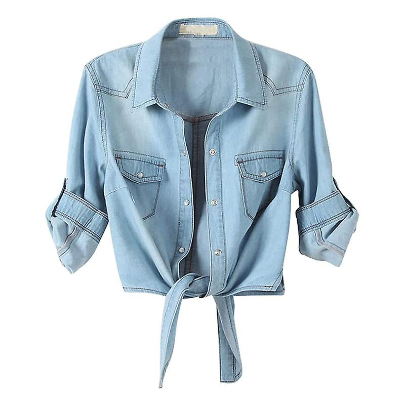 Women Casual Knot Tie Denim Shirt Sexy Solid Blue Jean Soft Denim Crop Top Streetwear Fashion Female Button Jacket Jean Mujer