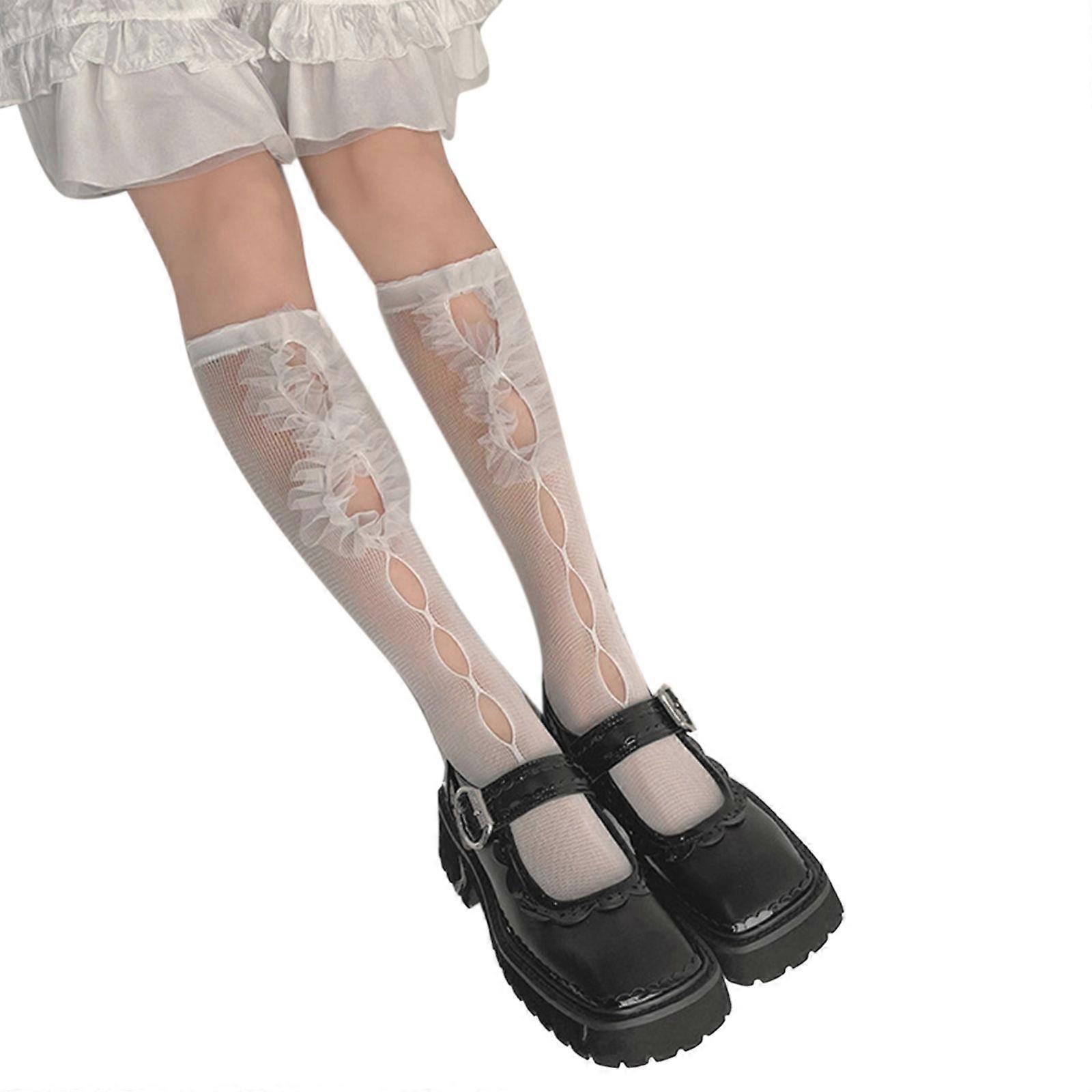 Women Lolita Sweet Fishnet Mesh Knee High Socks Japanese Style Hollow Out Hole Ruffled Lace Splicing Kawaii Stockings