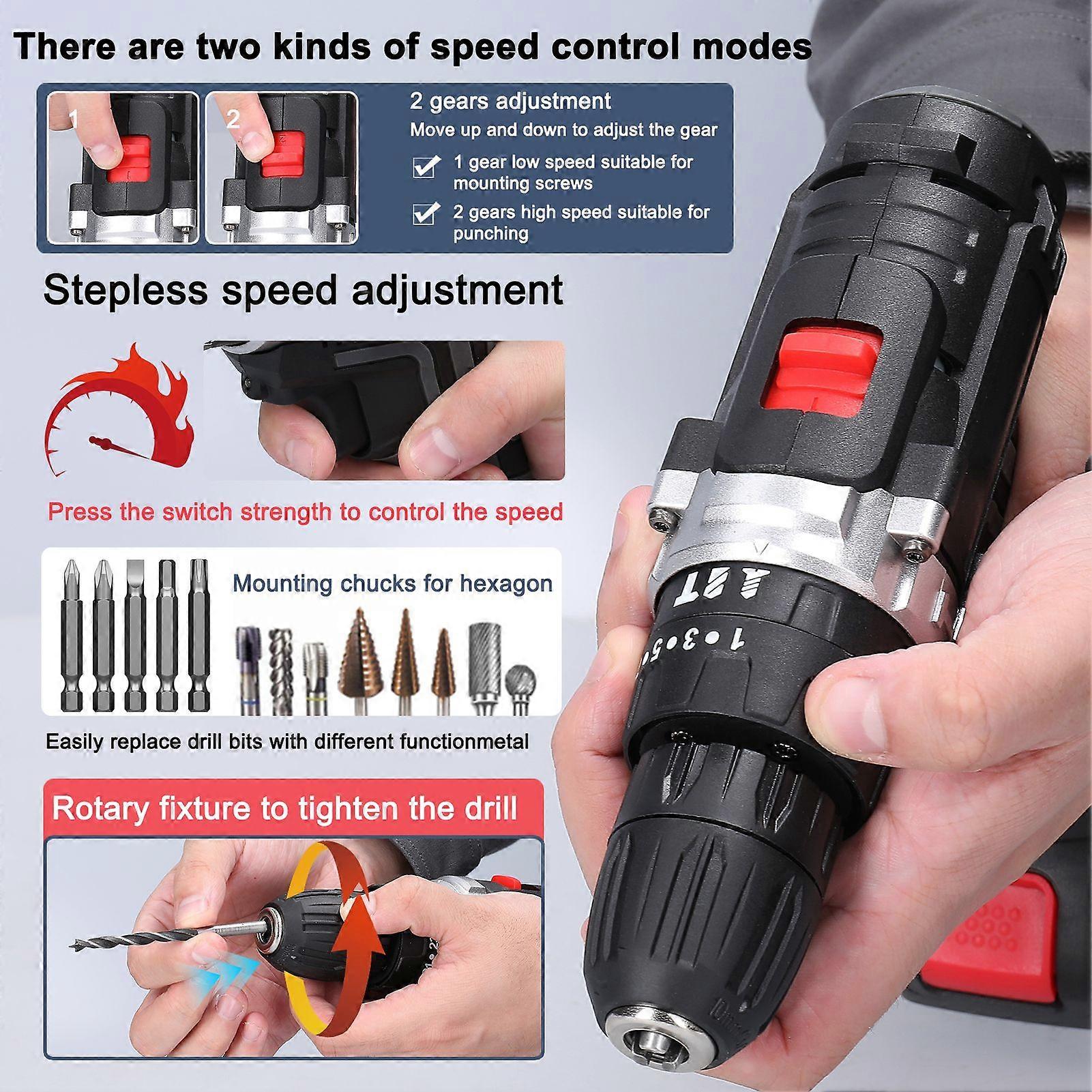 Feature:1. 3in1 Design: Multi-purpose and 3-in-1 design, it can be used as impact drill(punching on the wall, ground), flat drill(drill holes on the metal, PVC, plastics, wood) and screw screwing tool.2. Premium Material: Metal and plastics housing with rubber coating for long durability and increased reliability. All-metal gears and bearings are made of high-carbon steel and quenched and tempered for maximum accuracy and stability.3. 25 Torque Adjustable: Self-locked collet, provides 25 torque settings and 3 working modes, which can satisfied with all your demands.4. Two Speed Control Modes: There are two kinds of speed control modes, 2 speed gears adjustable and stepless speed adjustment for you to get the speed you want. Equipped with stepless speed change switch, easy to adjust the speed according to your needs. To vary the working speed, simply increase or decrease the pressure on the trigger, the greater the pressure added, the higher the speed is.5. Rotation Ways Adjustment \u0026 Safety Lock: The control switch has three positions: forward, reverse, and lock. The forward and reverse positions are designed to adjust the rotation direction of clockwise and anticlockwise. A lockout mechanism allows the control switch to bring the motor to a complete stop before use.6. Comfortable Handle: Ergonomic soft rubberized antislip handle design, easy to grip and comfortable to hold, practical and labor-saving.7. LED Indicator Light: Built-in LED working light, it opens automatically when the trigger is pressed, and can provide illumination in dark spaces, more convenient to use.8. Fine Heat Dissipation: Reserved several ventilation cooling holes, efficient heat dissipation, will not be hot for working long time.9. Rechargeable Lithium Battery: The 1300mAh high capacity lithium battery with overcurrent, overvoltage, overcharge, overdischarge, and over temperature protections.10. Wide Applications: Suitable for construction decoration, furniture installation and maintenance, DIY woodworking, etc.Specification:This versatile electric drill is 3in1 design, with forward and reverse rotation ways adjustable function for easy disassembly and installation. Adopts brushed motor, quick starting, timely braking, smooth operation, relatively easy to control the circuit and so on. Multifunctional design, it can be used as impact drill(punching on the wall, ground), flat drill(drill holes on the metal, PVC, plastics, wood) and screw screwing tool. Ergonomic anti-slip handle design, easy to grip and with comfortable hand feeling, practical and labor-saving. Suitable for construction site shelves, maintenance, woodworking, etc.Features:3in1 Design: Multi-purpose and 3-in-1 design, it can be used as impact drill(punching on the wall, ground), flat drill(drill holes on the metal, PVC, plastics, wood) and screw screwing tool.Premium Material: Metal and plastics housing with rubber coating for long durability and increased reliability. All-metal gears and bearings are made of high-carbon steel and quenched and tempered for maximum accuracy and stability.25 Torque Adjustable: Self-locked collet, provides 25 torque settings and 3 working modes, which can satisfied with all your demands.Two Speed Control Modes: There are two kinds of speed control modes, 2 speed gears adjustable and stepless speed adjustment for you to get the speed you want. Equipped with stepless speed change switch, easy to adjust the speed according to your needs. To vary the working speed, simply increase or decrease the pressure on the trigger, the greater the pressure added, the higher the speed is.Rotation Ways Adjustment & Safety Lock: The control switch has three positions: forward, reverse, and lock. The forward and reverse positions are designed to adjust the rotation direction of clockwise and anticlockwise. A lockout mechanism allows the control switch to bring the motor to a complete stop before use.Comfortable Handle: Ergonomic soft rubberized antislip handle design, easy to grip and comfortable to hold, practical and labor-saving. LED Indicator Light: Built-in LED working light, it opens automatically when the trigger is pressed, and can provide illumination in dark spaces, more convenient to use.Fine Heat Dissipation: Reserved several ventilation cooling holes, efficient heat dissipation, will not be hot for working long time.Rechargeable Lithium Battery: The 1300mAh high capacity lithium battery with overcurrent, overvoltage, overcharge, overdischarge, and over temperature protections. Wide Applications: Suitable for construction decoration, furniture installation and maintenance, DIY woodworking, etc.Specifications:Name: Electric Drill SetMaterial: metal+plasticsBattery: 1pcs battery, 2pcs batteries (optional)1pcs battery: 1 * 21V, 1300mAh lithium battery (included)2pcs batteries: 2 * 21V, 1300mAh lithium battery (included)Item size:Host: 200 * 57 * 220mm / 7.87 * 2.24 * 8.66inInstalled with battery: 200 * 75 * 220mm / 7.87 * 2.95 * 8.66inItem