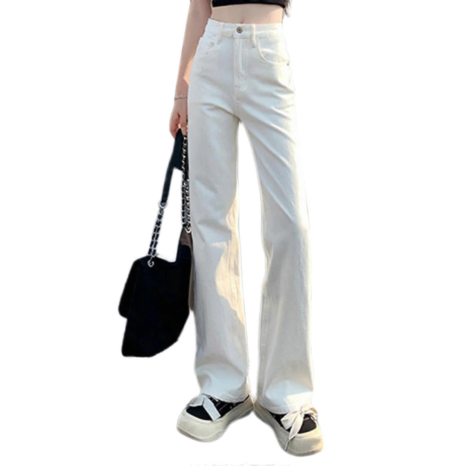 Women Summer High Waist Wide Leg Straight Jeans Pants Fashion Solid Color Casual Loose Denims Trousers with Pockets White XL