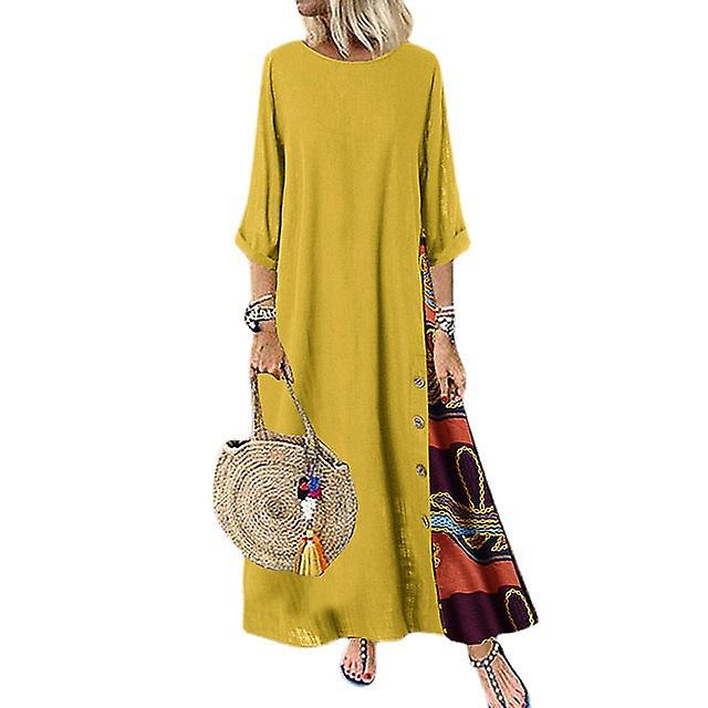 Women Girls Dress Comfortable Vintage Floral Round Neck Contrast Color Button Stitching 3/4 Sleeve