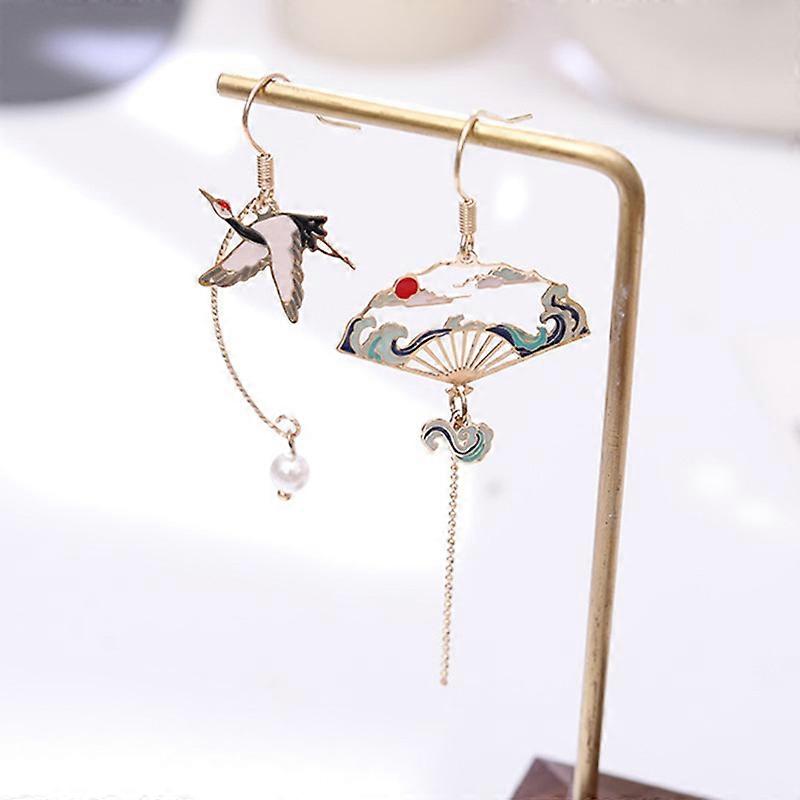 Chinese Style Folding Fan Crane Carp Lotus Asymmetrical Long Tassel Dangle National Style Earrings for Women Jewelry Gift