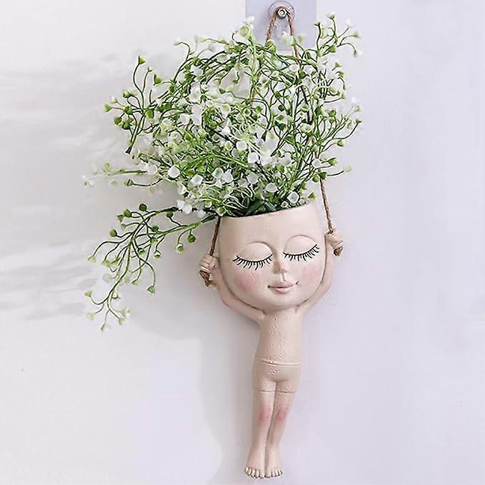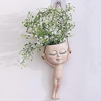 Face Flower Pot Head Planter Pot Resin Plant Pot Gymnastics Doll Hanging Flower Pot Vase Closed Eyes Art Statue Human Body Flowerpot for Succulent Cac