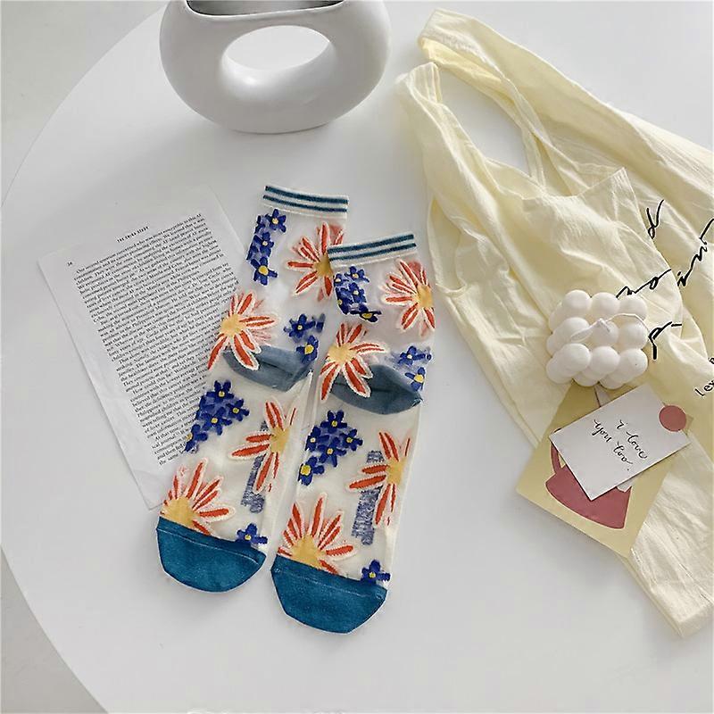 Fashion Summer Crystal Silk Socks Women Novelty Harajuku Floral Kawaii Cute Socks Ultra-thin Transparent Fishnet Mesh Lace Socks
