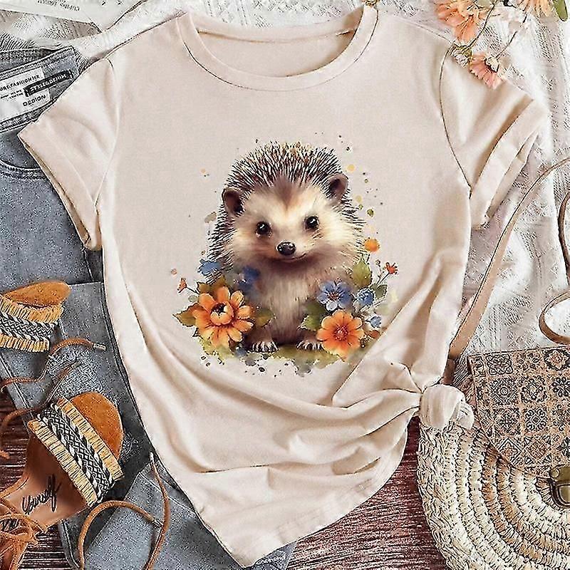 Fashion Women Cute Animal Hedgehog Flower Print T Shirt Funny Casual O-neck Short Sleeves T-shirt Summer Female Tee Shirt