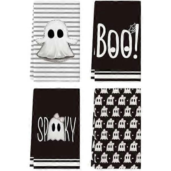 Black Striped Ghosts Boo Spooky Halloween Kitchen Towels Dish Towels, 18x26 Inch Bow Decoration Set of 4