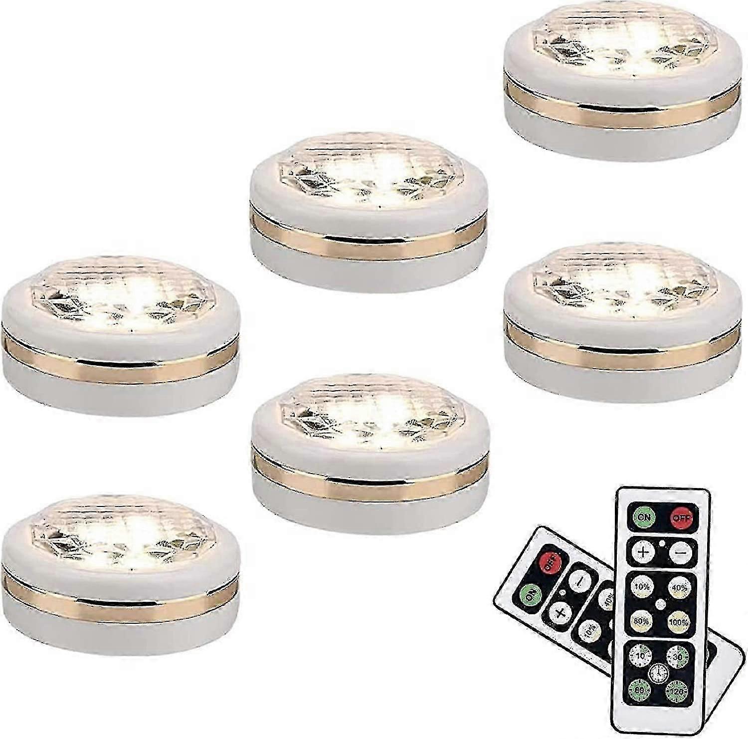 TWO CONTROL MODES: Turn the remote controlled puck lights ON/OFF with the remote or the tap lens. The best remote control distance range: 1.6 feet~21 feet. SELECTABLE DIMMER: Long touch +/- on the dimmable closet light surface or use remote control to adjust the brightness (10%,40%,80%,100%). TIMER PRESETS & ENERGY-SAVING DESIGN: Set the Under Cabinet Lights to turn off in 10, 30, 60 or 120 mins. It will turn off automatically in 30 minutes without any operation to prevents battery consumption when forget to time or turn off. BATTERY POWERED: The led battery puck lights are powered by 3*AAA batteries (NOT INCLUDED), but 1 lithium-ion battery in the remote WIDELY APPLICATION: This 3500-4000K wireless led light is perfect for your Cabinet Closet Bedroom Kitchen Pantry Bookcase Bathroom Hallway Stair Basement Garage puck light etc. Quick Delivery: Shipped from US warehouse within 1-3 days. Old brand but new store for new market with more than 10 years in producing LED products made from nice material offers cost-effective merchandise for you, our customers. Advantages: 1.The?under?kitchen?cabinets lights which are?lightweight and mini size can be placed?anywhere you want . 2.It can?also?be emergency lamps for protecting your family. 3.These cordless puck lights can be controlled by one remote or tapping on the lens of the surface. 4.The?battery powered puck lights have?an optional timer that will automatically turn the lights off in 10,30,60 or 120 minutes. This?light fixtures of?under shelf lights?included 6*3M adhesive taps to stick on anywhere. 5.The?countertop lighting?operated by 3 AAA batteries (battery not included), but 1 lithium-ion battery in the remote 6.Excellent Warranty: We will do our best to serve our clients. 6. If you get any problem or difficulty. Please feel free to contact us and we will reply you within 24 hours.? Specifications: Light Source: LED LED Beads: 5PCS Lumen:?60-120 CCT: 3500-4000K Run Time: 100 Hours(10% brightness) Power Source: 3*AAA Batteries (NOT included) ? Package:Safety Information Safe and portable