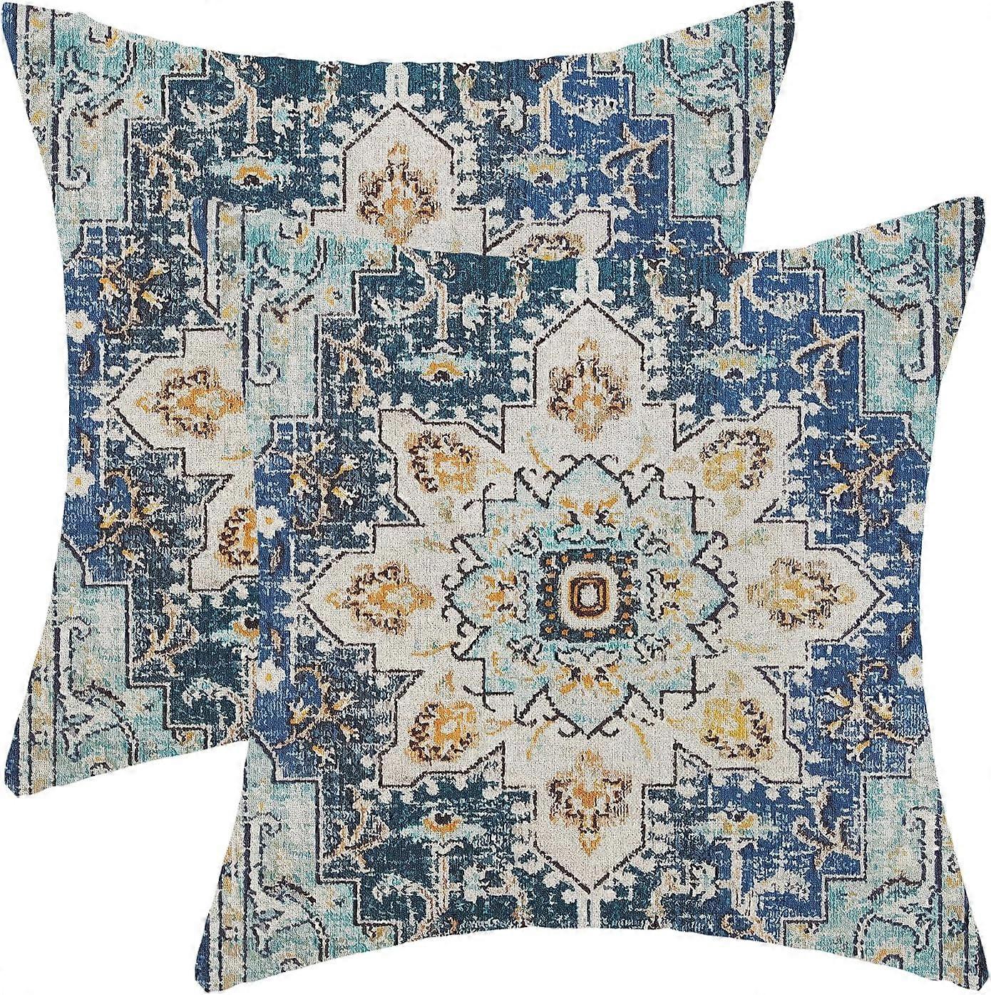 Boho Pillow Covers 16x16 Inch Set of 2,Carpet Pattern Throw Pillows Case,Blue Yellow Ethnic Design Outdoor Decorative Square Linen Farmhouse Decor Cus