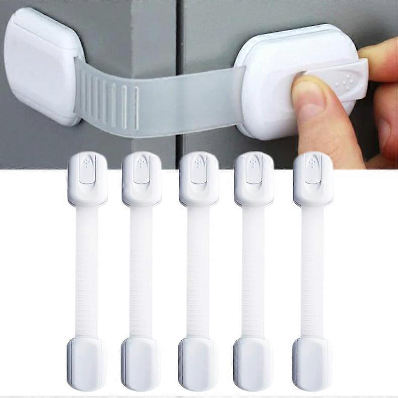 PROTECT YOUR CHILD FROM DANGER -- Prevent baby from opening fridges, cabinets, drawers, dishwasher and toilet to avoid clamping fingers, messing up, eating wrongly or taking out the dangerous items to cause unnecessary harm. PROTECT YOUR CHILD FROM DANGER -- Baby proof cupboard latches are easy to use for adults, but nearly impossible for a child to figure out - and even if they can, they lack the finger strength to easily depress the buttons.Protect baby and pets from getting injured while are explore your home. MULTIPURPOSE USE & ADJUSTABLE STRAPS -- Child safety drawer strap locks can be used for kitchen cabinets,cupboards,drawers,door,window,refrigerator,oven,freezer,toilet seat,fridge,trash can,washing machine,electric appliances, etc. EASY TO INSTALL AND EASY TO USE -- Thanks to the adhesive strong industrial grade tape they have on both sides, you can install and remove them within seconds. No drilling or any special tools needed! And dont worry about your furniture, these straps leave no residue and wont cause any damage to it! This means no holes in the cabinets, and extra -easy installation! With our product, installing cabinet locks safety is a hassle-free process. VALUE PACK OF 5 SAFETY LOCKS -- These safety locks use heavy-duty but removable strips so you do not need to worry about the permanence of screws or drilling holes to your cabinets or appliances. Besides, if you plan to remove and reuse them. When youre done with the child-proofing stage, you can easily remove them by heating a hairdryer.