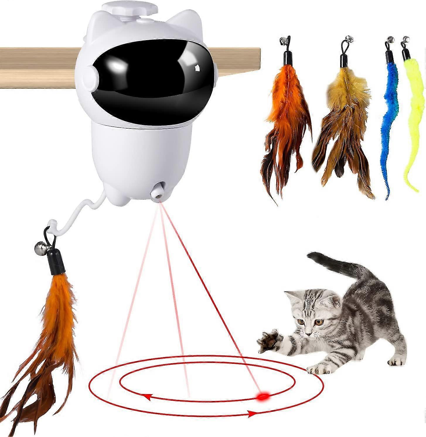 [2 in 1 Interactive Cat Toys]-- Multiple ways to play with our interactive cat toys. Combines with feathers toys and automatic cat light point. 2-in-1 kitten toys will simulate our cat`s hunting, catching, swatting, and pouncing instinct. This entertainment of interaction is so important to indoor cats, give our cat a new experiences,and explore and use them cat's instinctions. [Rechargeable Interactive Cat Toys For Indoor Cats]-- Built-in large capacity 1800 mAh battery, charged in 4 hours only, that can be used last for 12 hours. Interactive cat toy will be shut down in every 30 minutes automatically then work again after 3 hours. So that your indoor kitten can play with our automatic cat toy when you are out or being busy. Also interactive cat toys can be easily assembled by the easy fastener. [Adjustable Toys for Cats]-- By the easy fastener can fix the cat toys on the surface of thickness less than 1.1 inches,like table, cat tree, cat tower, or door handle, etc.The light pointer and feathers with ringbell,360rotations bring your cats a different experience and pleasure. Adjust the light up and down to change the range of the red point. 20db low-noise design won't disturb or scare your cat. Our interactive cat toy can be more attractive than other interactive toys. [Easy Operation of Interactive Toys for Cats]-- Our interactive cat toys can adjust the speed by one-key control, press one time for Slow Mode, second times for the Fast way ,then press again will shut it off. The interactive cat toy allows you to adjust to play to match your cat's mood and activity level while also keeping it fresh and unpredictable, can get even the laziest kitty moving for a more active and healthy lifestyle. [Benefits of Interactive Toys for Cats]-- Our interactive cat toy is made of ABS material, which has high toughness and tensile strength that will not be scratched or bitten by your cats. Unlike other cat toys, our interactive toys help strengthen the human animal bond and can also help relieve stress for a cat that is experiencing stress in its environment.
