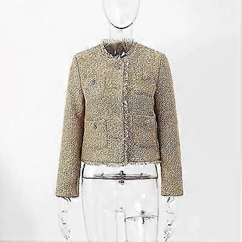 أنيقة المرأة طويلة الأكمام زر المتوترة اقتصاص تويد سترة جيب شرابة معطف جيد