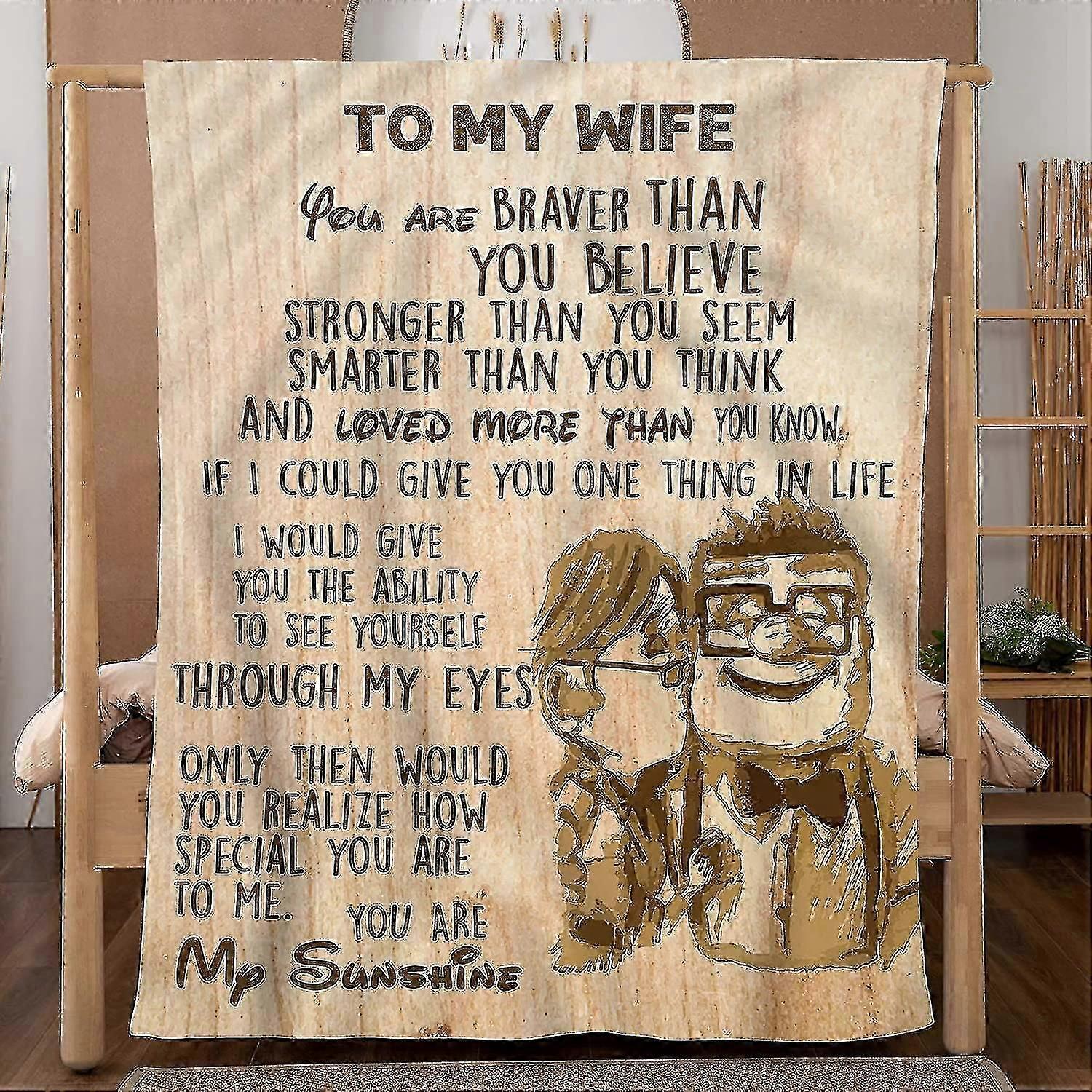"Letter:To my wife,you are braver than you believe stronger,than you seem smarter,than you think and loved more than you know.If I could give you one thing in life,I would give you the ability to see yourself through my eyes only then would you realize,how special you are to me.You are my sunshine.^Birthday Gift for Wife from Husband: This healing thought throws blanket to wife from husband is specially designed for expressing love between couples. The purpose of this throw blanket is not only to bring warmth but also to bring love. The best gift for my wife blanket, wife birthday gift, wife gifts from husband, gifts for wife romantic, gifts for my wife, wife blanket,wife anniversary gifts for her,blanket for wife,wife blanket from husband.^Best Wife Gift: This blanket is the perfect gift for your wife on special occasions like birthdays, Mothers Day, Valentine's Day, anniversary, and so on.Suitable everwhere. Good choice for bed, sofa, camping, office, cold cinema or travel^Washable: This blanket is designed to prevent fading and wrinkling and has many years of durability, softness, and warmth. It can be washed separately in the washing machine with a gentle cycle, cold water, and low to low drying rate, and there is no bleeding or fading after washing.^Versatile Usage Scenarios: These flannel blankets are great for a picnic at the park, watching TV, relaxing on the sofa, wall decoration for home, or as a stylish bedspread. Perfect for indoor and outdoor use to provide consecutive warmth in all seasons, especially for camping, travel, and picnic."
