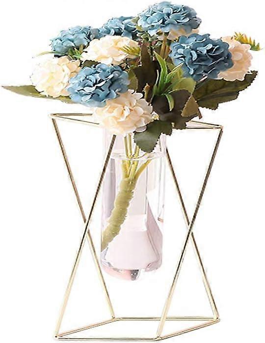 Glass Flower Vase with Metal Stand Modern Geometry Desktop Glass Planter Indoor Hydroponics Plants for Home Office Garden Wedding Decor (Gold, M)