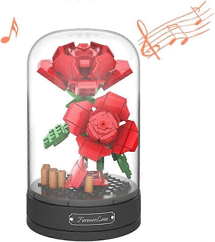 Flower Bouquet Building Blocks Music Box | Red Rose with Glass Dome, Artificial Flowers Building Project to Release Stress and Focus The Mind , Valent