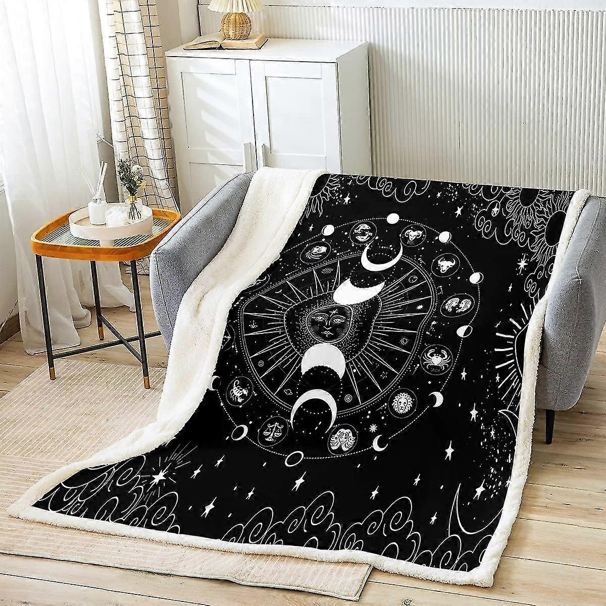 Black Sherpa Blanket with Sun, Moon, Zodiac and Galaxy Constellation Design for Sofa or Bed Stylish Cosmic Mandala Theme Decorative Throw