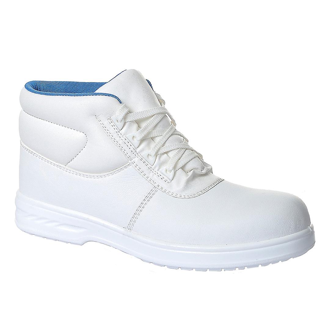 Introducing the Portwest FW88 Steelite Albus Laced Boots S2, the epitome of safety and functionality at an unbeatable price. These boots are designed with a water-resistant upper and a protective steel toecap to ensure your feet stay dry and protected in any environment. The antistatic and slip-resistant dual-density outsole offers unparalleled stability on both ceramic and steel surfaces, making these boots ideal for janitorial work. Additionally, the self-cleaning outsole prevents cross-contamination, ensuring a high level of hygiene in sensitive areas such as Clean Rooms, Medical, and Food Industries.